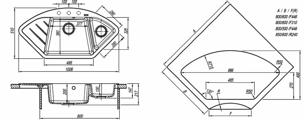 Мойка кухонная угловая Флорентина Веста Антрацит (20.285.Е1005.302)