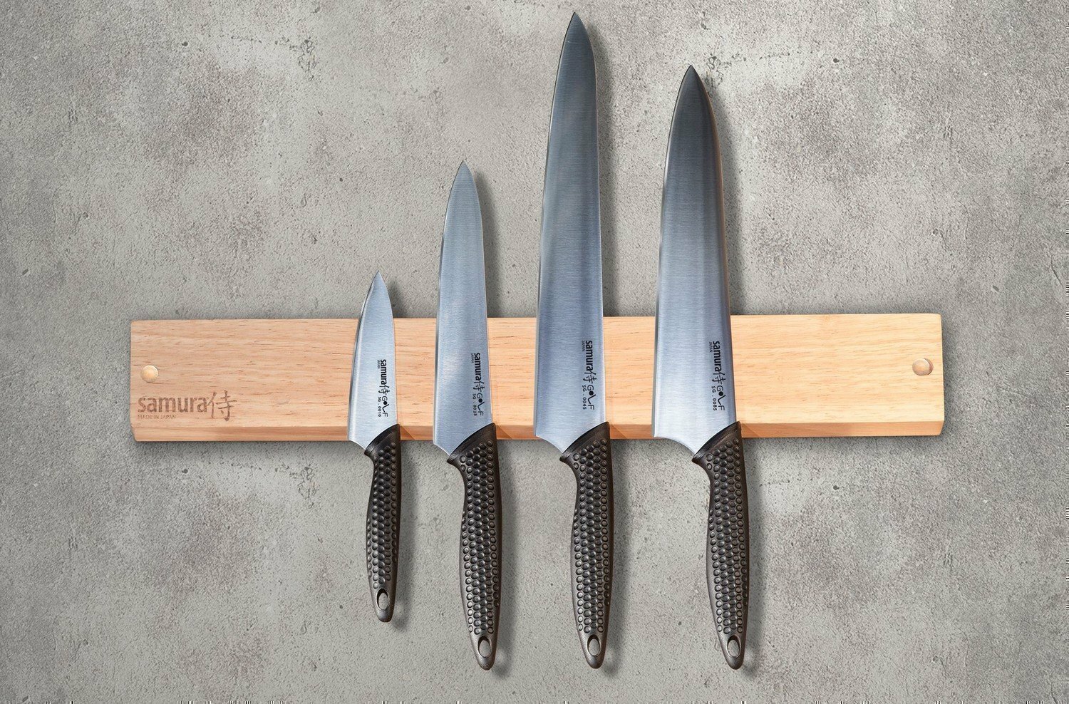 SG-0240МДЭМРАНЭЛТ набор из 4-Х ножей SAMURA GOLF овощной, универсальный, слайсер, Шеф, магнитный держатель и электроточилка