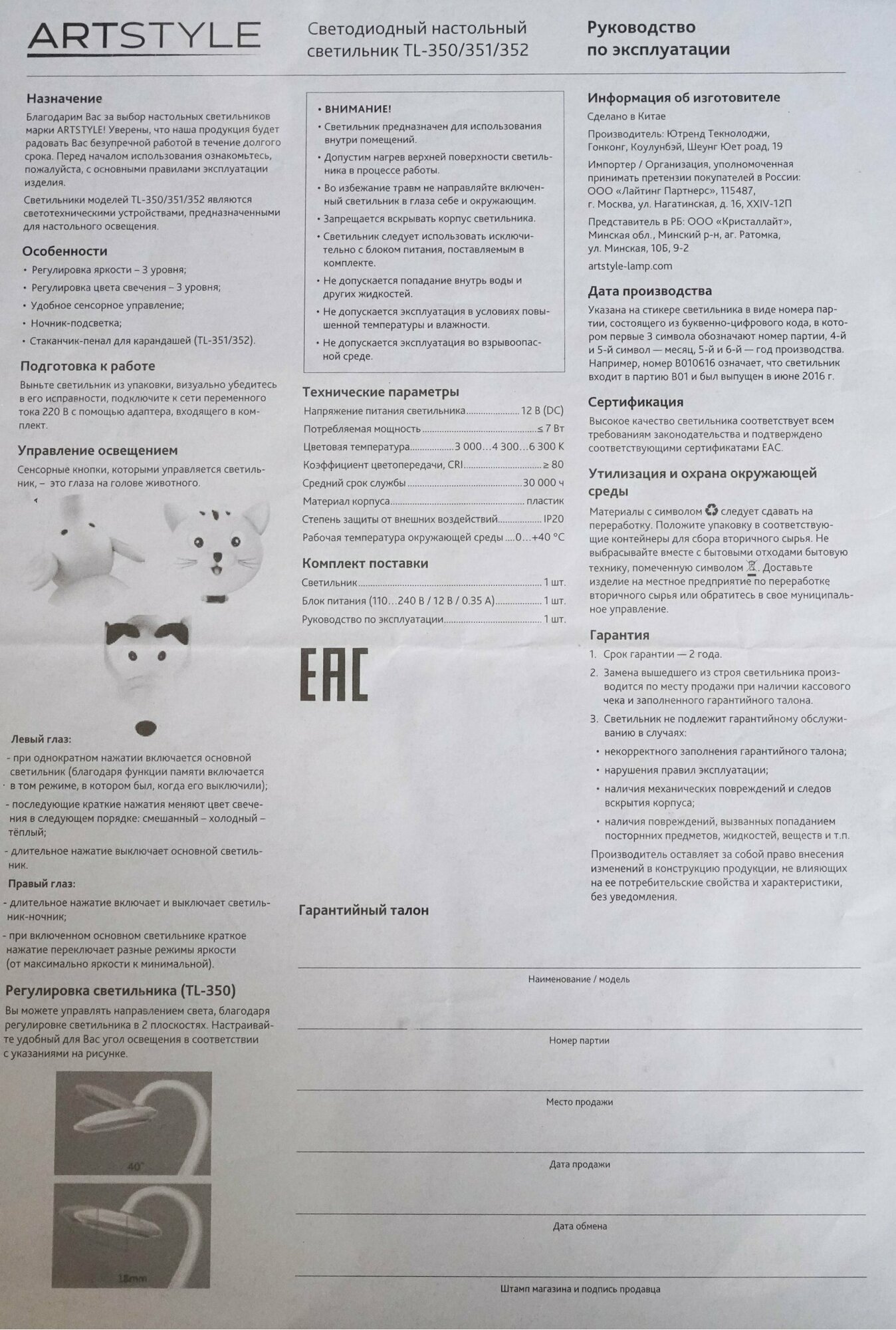 Лампа настольная Artstyle TL-351W, 7Вт, LED, сенс. упр, ночник, белый интересное: