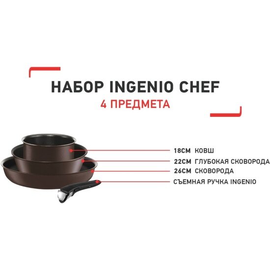 Набор посуды TEFAL Ingenio Chef, сковорода 26, вок 22, ковш 18 см, съемная ручка интересное: