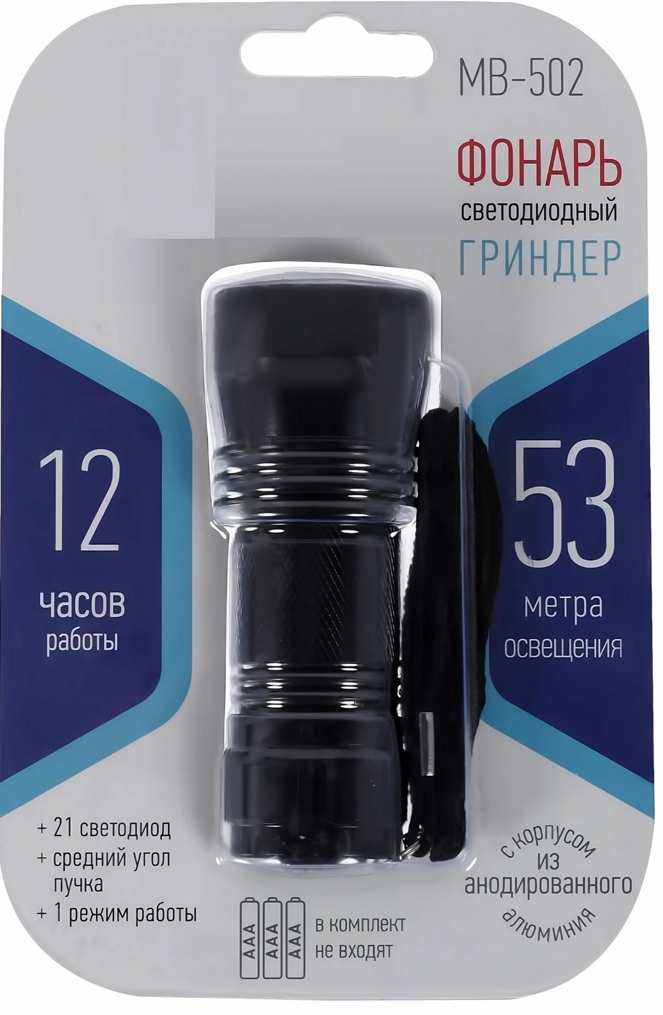 Фонарь ручной MB-502 Гриндер 1.5Вт, алюминиевый, черного цвета, с ремешком для запястья, яркий белый свет поможет ориентироваться в темноте или рассмо