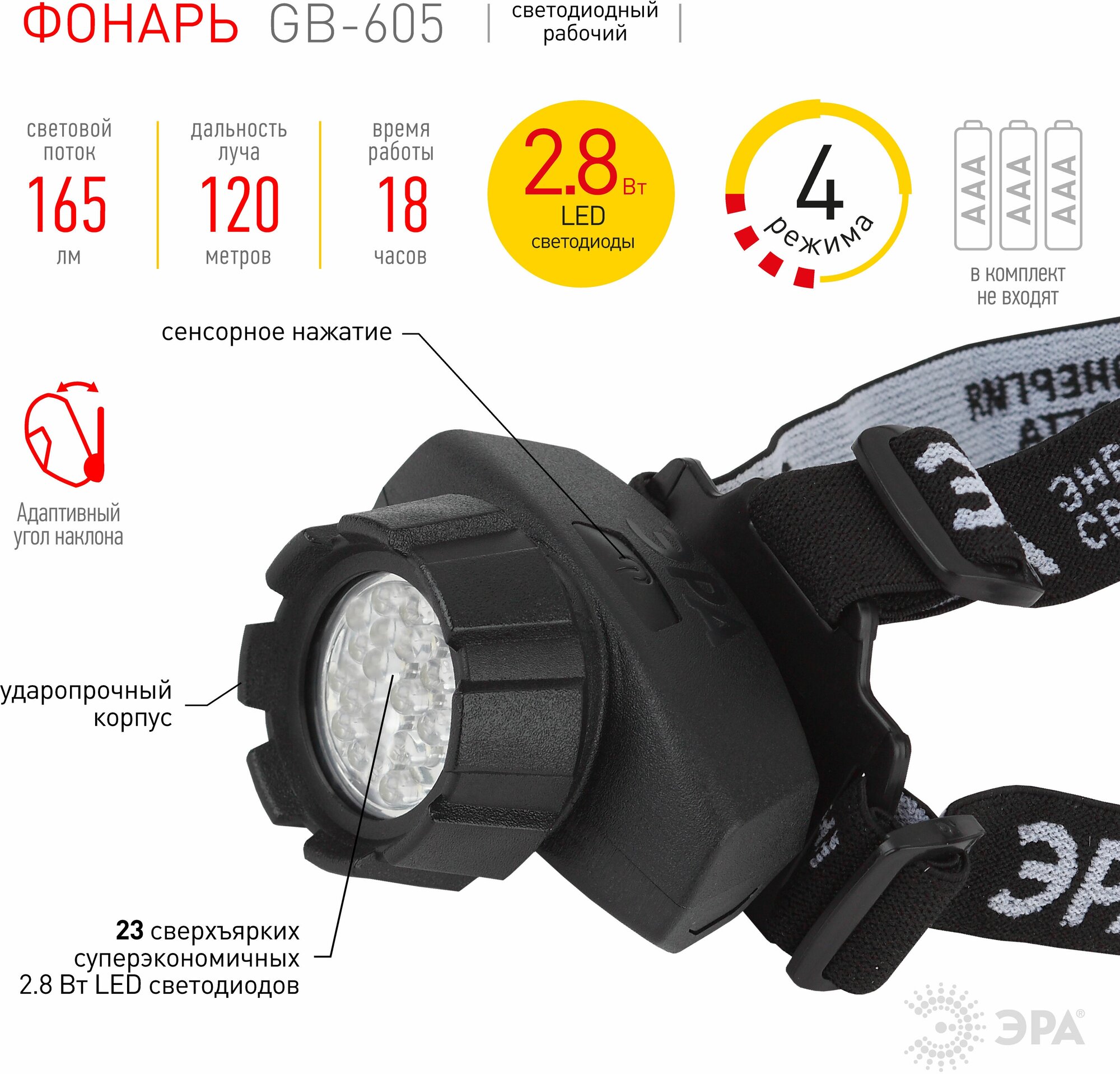 Фонарь налобный GB-605 ЭРА (23xLED, 3xAAA, 4 режима)