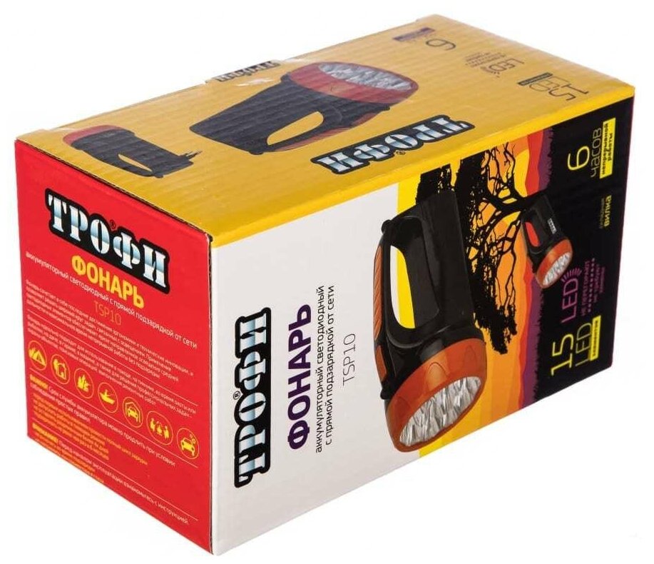 Трофи Б0016537 Фонарь-прожектор аккумуляторный TSP10 15LED 2 режима 4В 1.5А.ч ЗУ 220В (картон. упак.) Трофи Б0016537