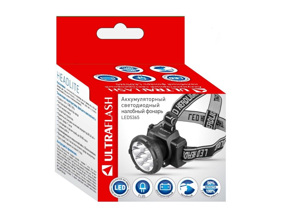 Фонарь налобный аккум. LED5365 (220В, черный, 5 LED, 2 реж, пласт, бокс) Ultraflash