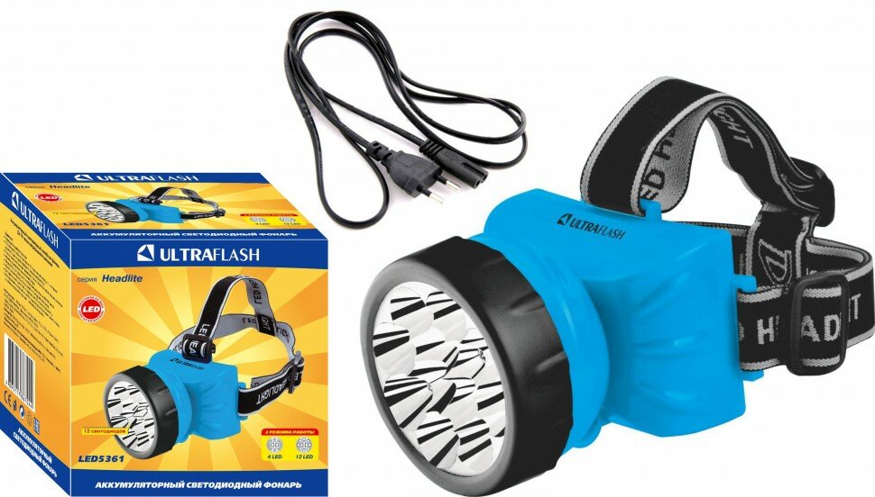 Ultraflash Фонари LED5361 фонарь налобн аккум 220В, голубой, 12LED, 2 реж, пласт, бокс