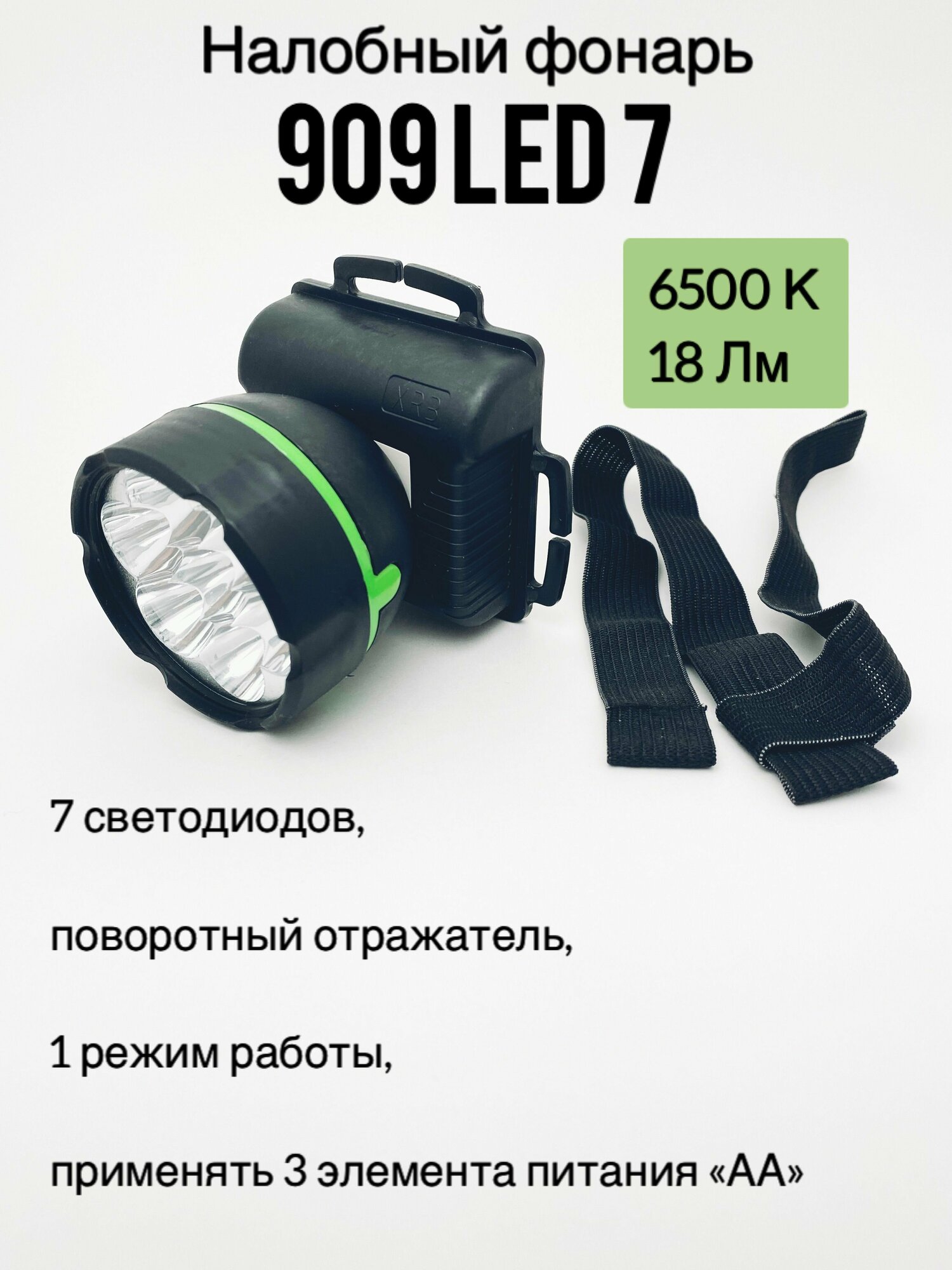 Фонарь 909LED7 налобный, черный, 3хR6, 7LED, 1режим Ultraflash