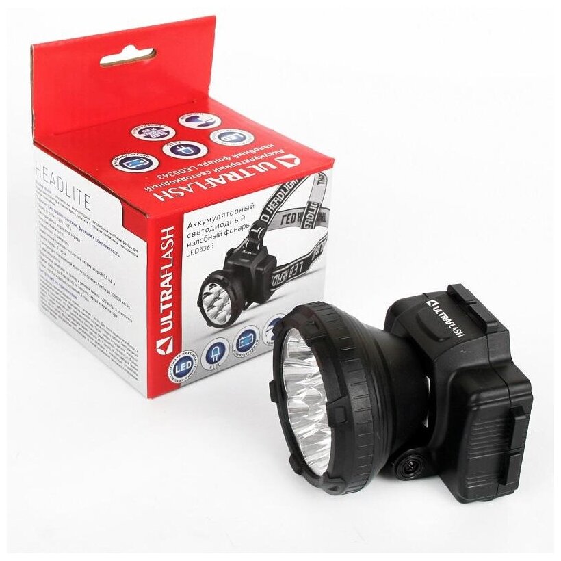Фонарь налобный Ultraflash LED5363 аккумуляторный 220В, 9LED, 2 режима, пластиковый корпус, черный