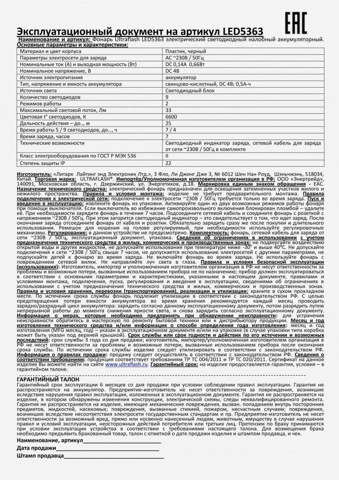 Фонарь аккумуляторный налобный LED5363 9LED 2 режима 220В пластик. черн. (бокс) Ultraflash 11257