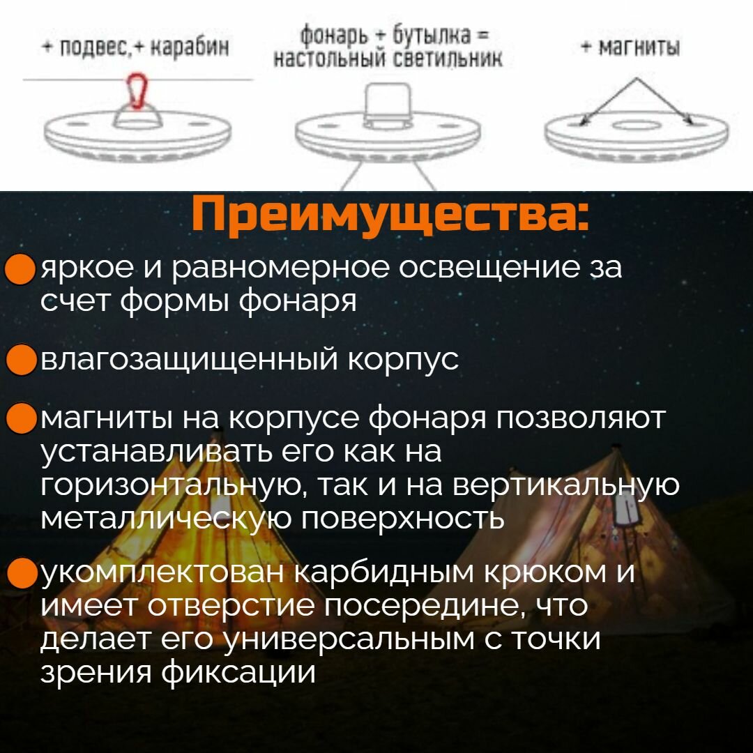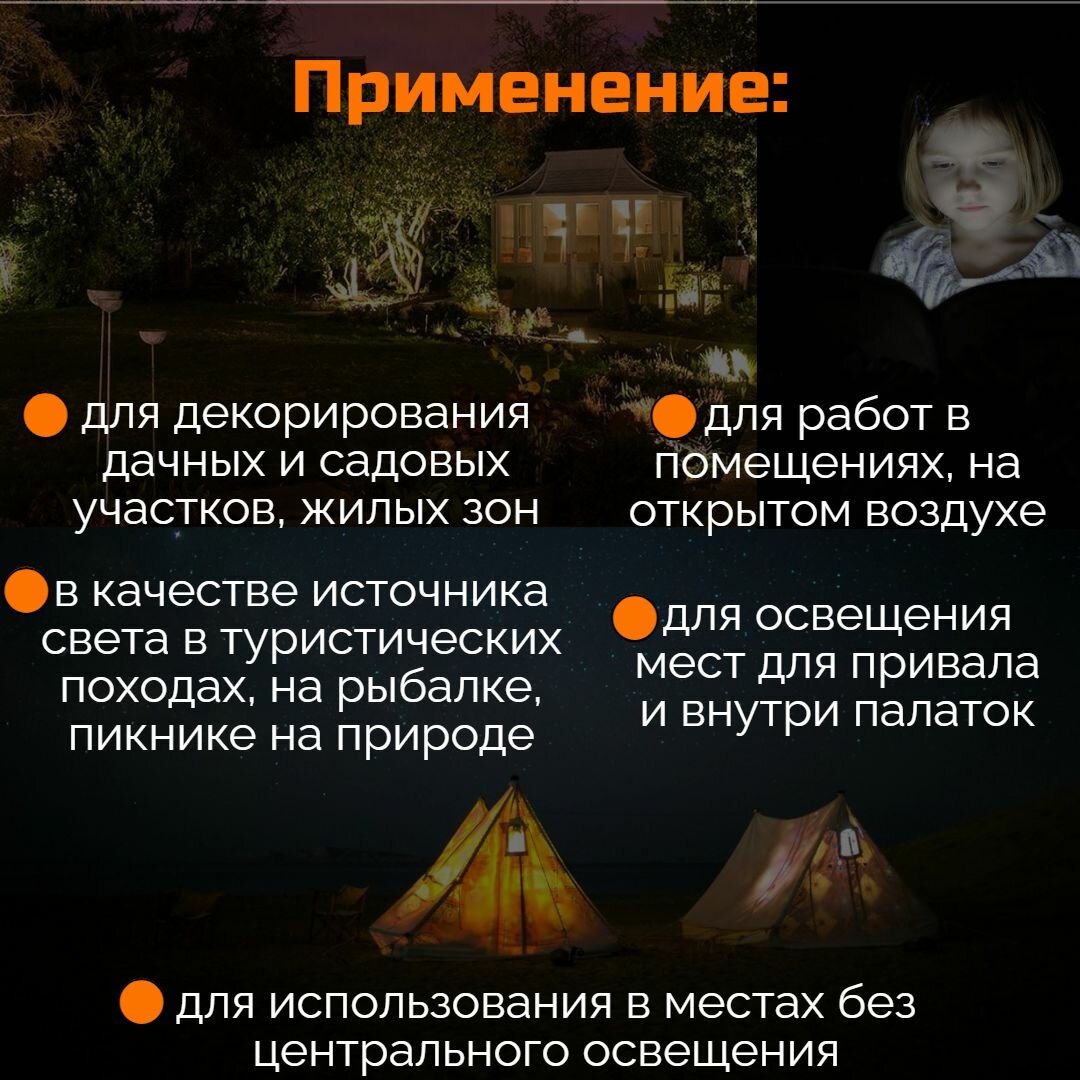 | Плюсы: | Супер яркость для палатки и можно освещать комнату в квартире. |