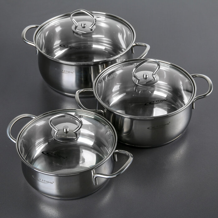 Катунь Лира, Набор кастрюль 6 предметов (1,6л; 2,2л; 3,2л; материал: нержавеющая сталь; капсулированное дно; стеклянные крышки)