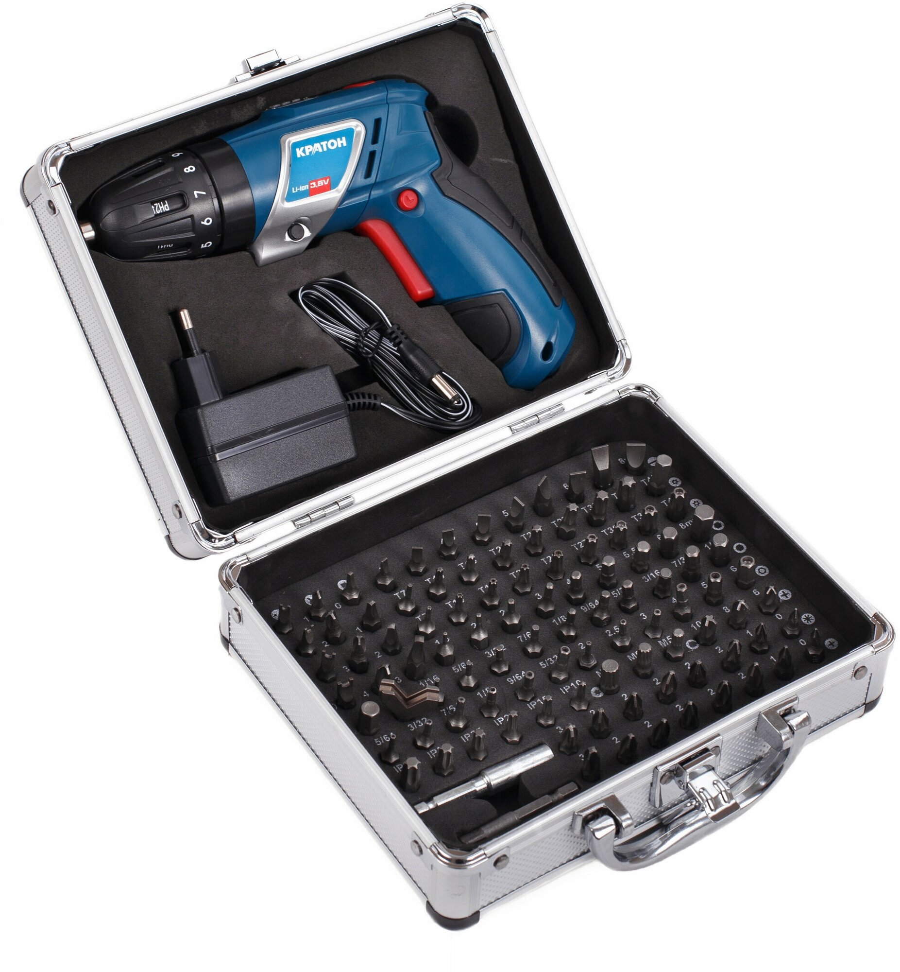 Шуруповерт аккумуляторный Кратон CSL-3K-H (3,6 В, 1,3 А·ч; алюминиевый кейс, расширенная комплектация с битами и держателями бит)
