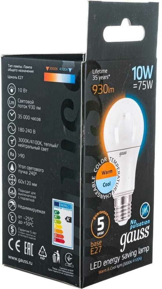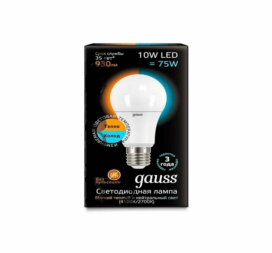 Gauss Лампа Gauss LED A60 10W E27 930lm 3000K/4100K CTC 1/10/50 102502110-T