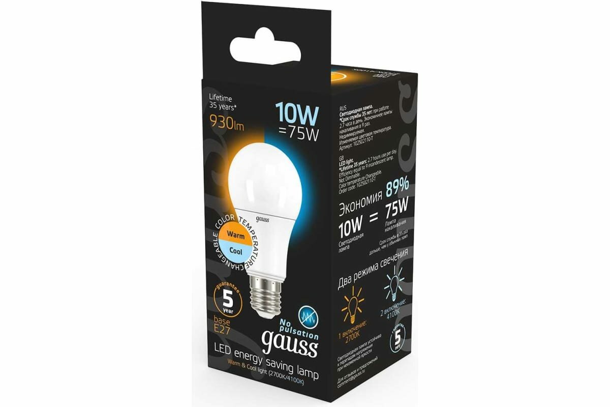 Лампа светодиодная 2 режима Gauss 102502110-T LED A60 10W E27 2700K/4100K