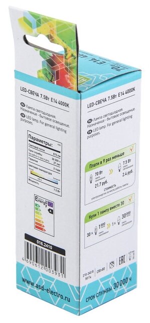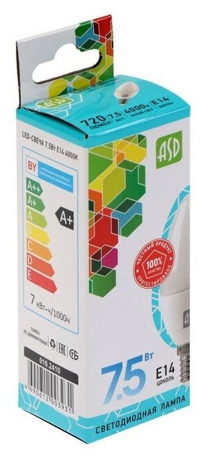 Лампа светодиодная ASD LED-СВЕЧА-STD 4000K, E14, C37, 7.5Вт, 4000 К интересное: