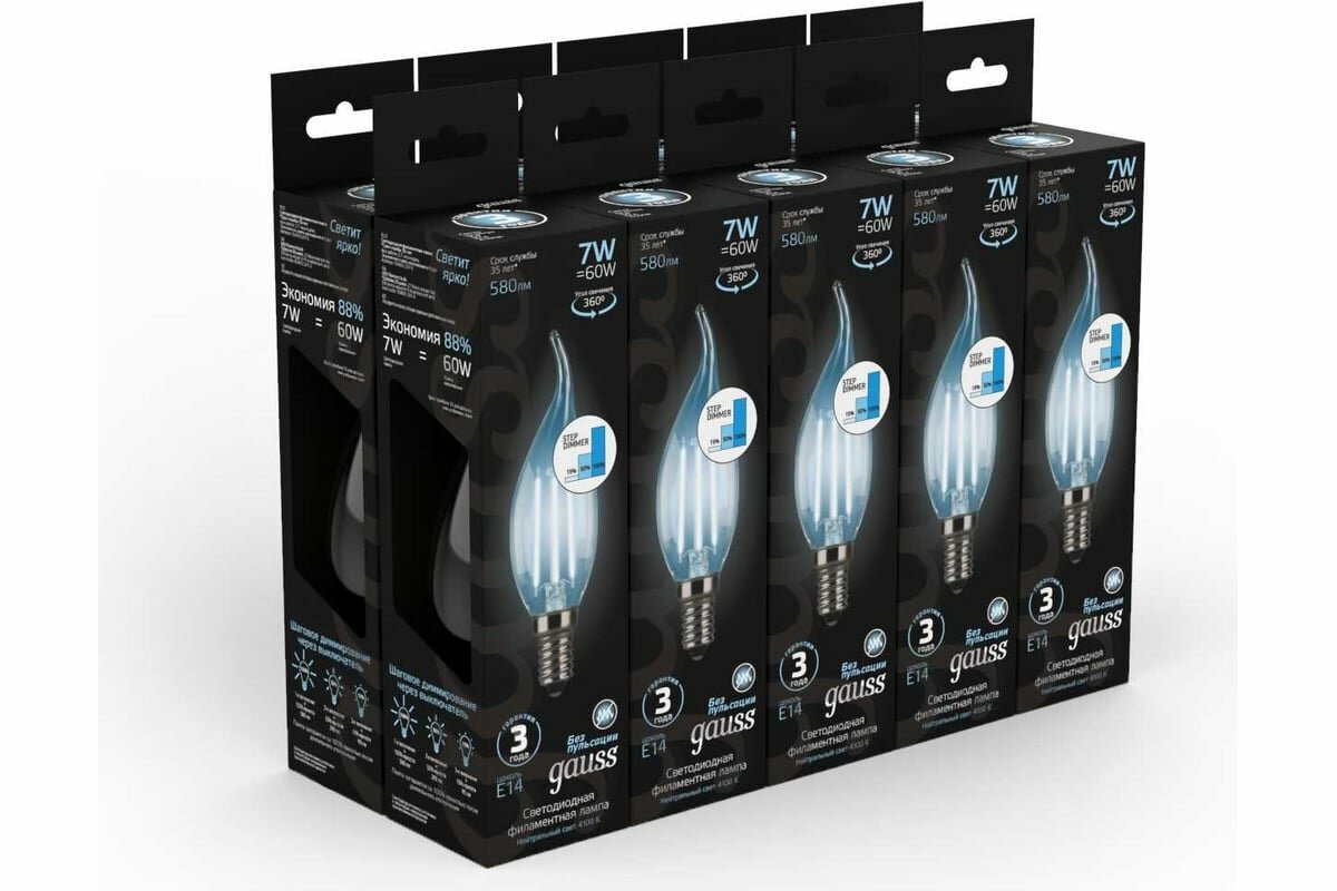 Лампа светодиодная филаментная LED 7 Вт 580 лм 4100К AC185-265В E14 свеча нейтральный шаговое диммирование выключателем Black Filament, GAUSS 104801207S (1 шт.)