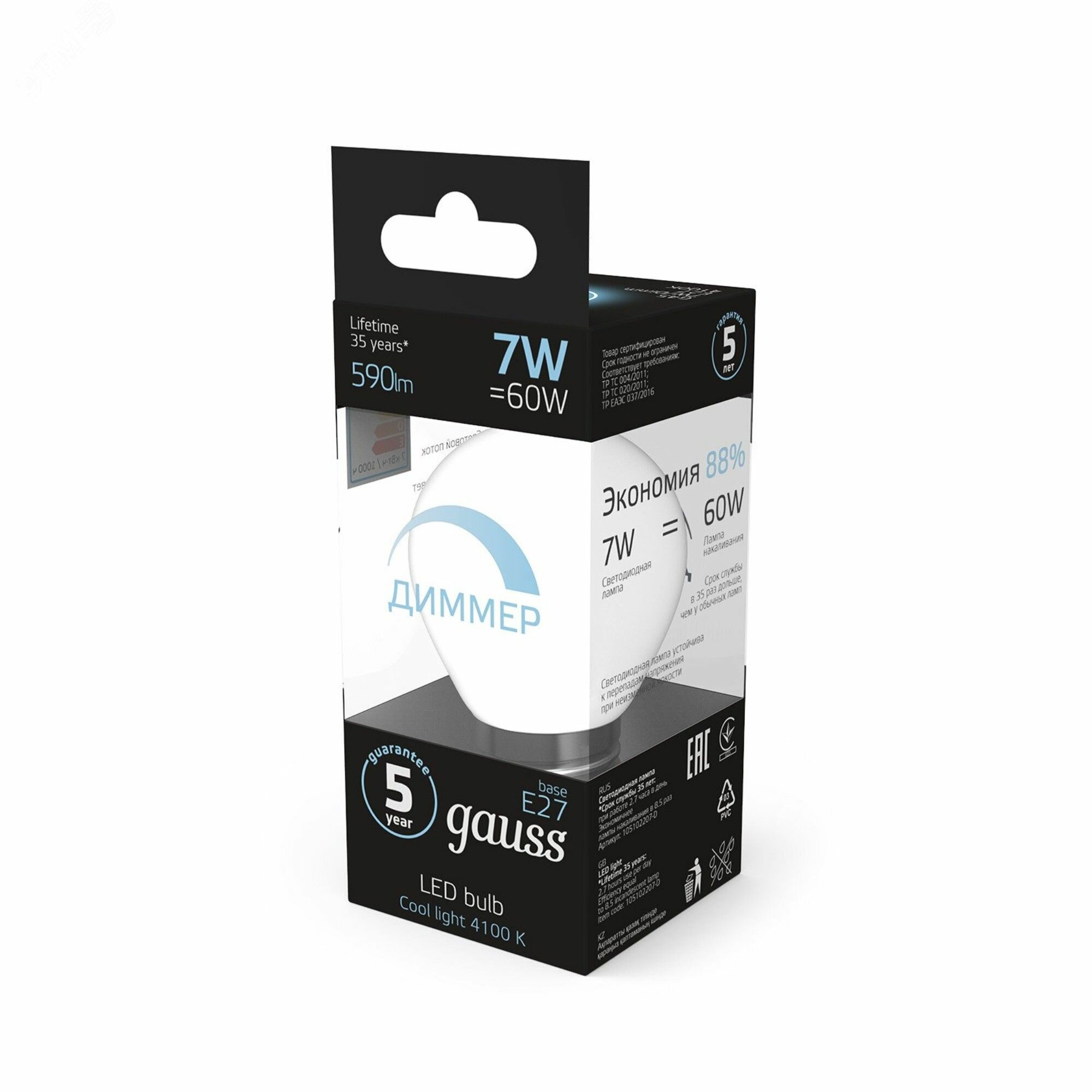 | Эквивалент лампы накаливания | 60 Вт |