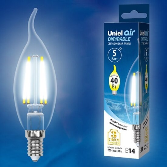 1шт. - Лампа светодиодная LED 5вт 200-250В свеча на ветру диммируемая 450Лм Е14 4000К Air филамент / Uniel; арт. UL-00002865; оригинал / - комплект 1шт