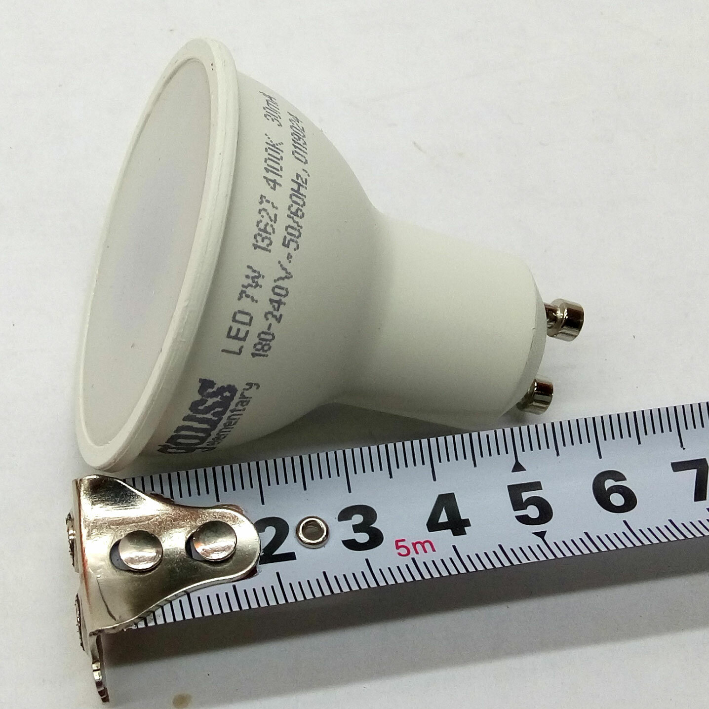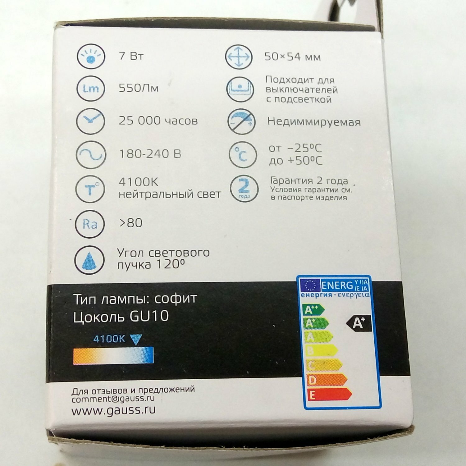 (7 шт.) Светодиодная лампочка Gauss MR16, мощность 5.5 Вт, напряжение питания 220 В, цветовая температура 3000 К, теплый белый свет, световой поток 430 Лм, цоколь GU5.3, размер 50х50 мм