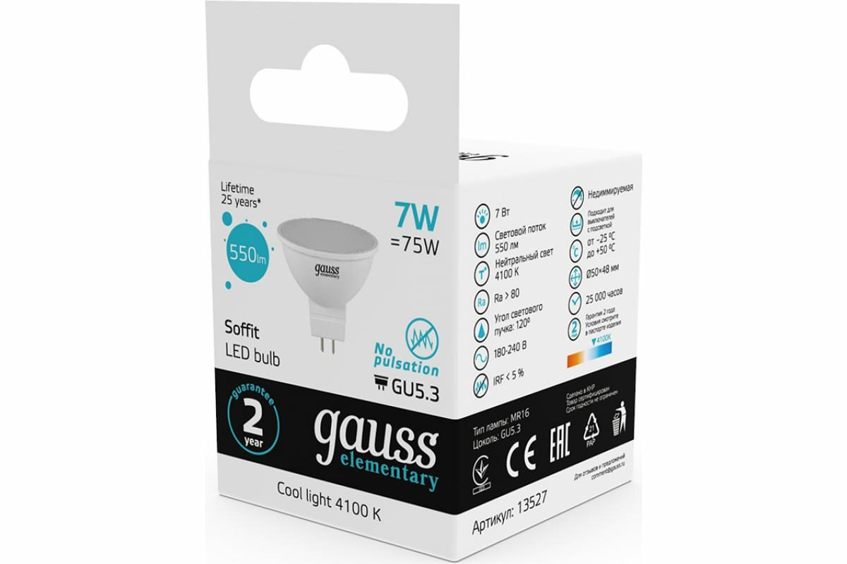 Лампа светодиодная gauss 13527, GU5.3, MR16, 7 Вт, 4100 К