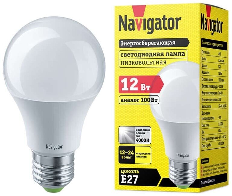 Светодиодная лампа Navigator Group 61 477 NLL-A60-12-12/24-4K-E27 12Вт грушевидная матовая 4000К нейтр. бел. E27 1000лм 12-24В низковольтная NAVIGATOR 61477