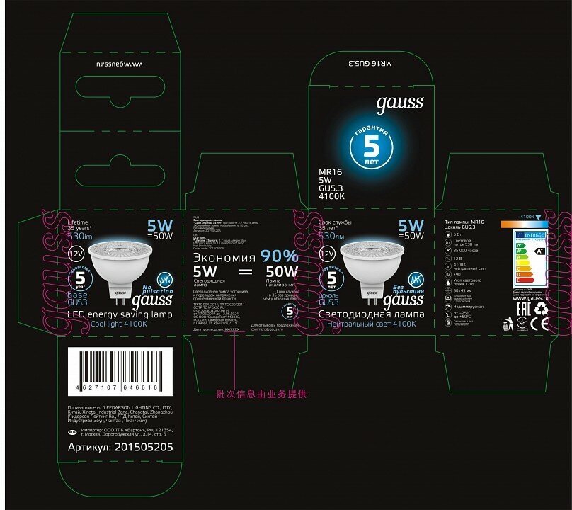 10шт/уп. Лампа LED Спот 5Вт 12B MR16 GU5.3 530Лм 4100К Свет Нейтральный белый арт. 201505205 Gauss, уп. 10шт