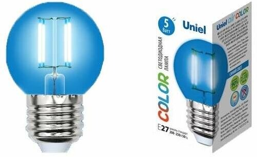 Типы/Лампочки/Декоративные Uniel Лампа светодиодная филаментная Uniel E27 5W синяя LED-G45-5W/BLUE/E27 GLA02BL UL-00002990 интересное: