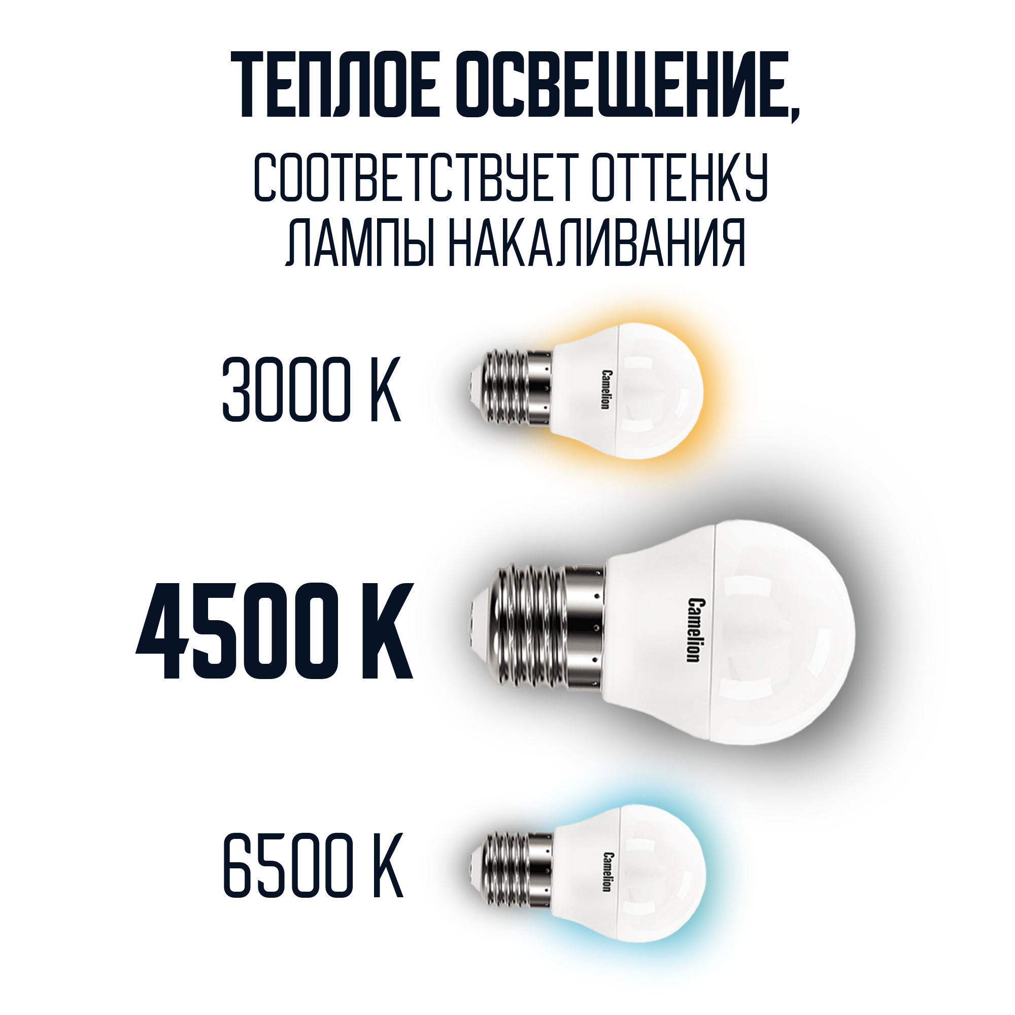 Светодиодная лампа шарик 7Вт Е27 4500К(холодный белый свет) - LED7-G45/845/E27 (Camelion) (код заказа 12072 ) интересное: