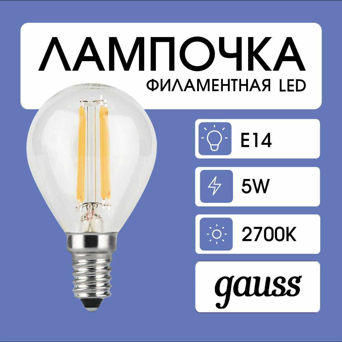 (1 шт.) Светодиодная лампочка Gauss Filament Шар G45 E14 5W(420lm) 2700K 2K 80x45 филамент (нитевидная), прозр. 105801105 Теплый белый. Цоколь E14