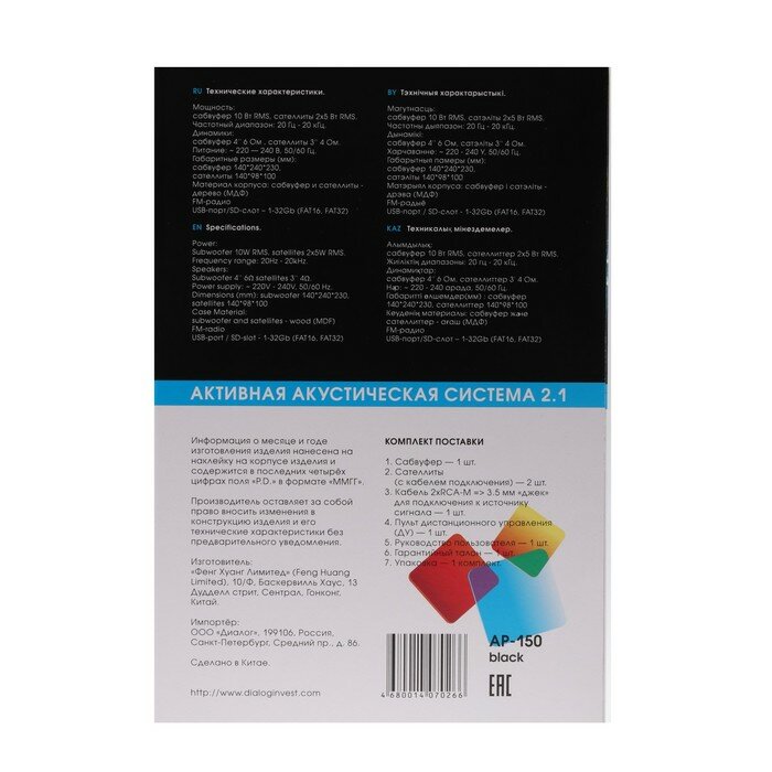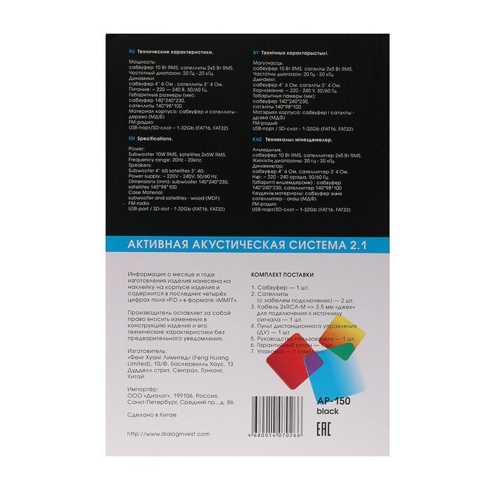 Компьютерные колонки 2.1 Dialog AP-150, 2 х 5Вт + 10Вт, MP3, пульт ДУ, 220В, черные интересное: