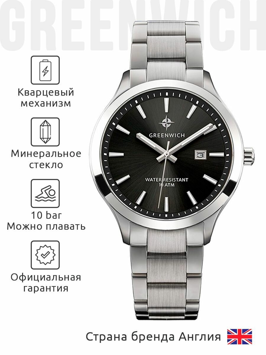 Английские кварцевые часы Greenwich GW 041.10.31 на стальном браслете, с водозащитой 10 бар и международной гарантией от производителя