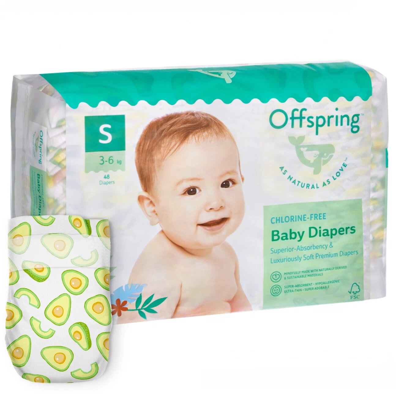 Offspring Подгузники размер S, расцветка "Авокадо", 3-6 кг, 48 шт