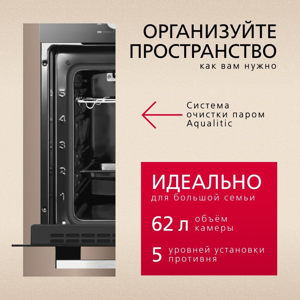 | Дополнительная информация | вентилятор охлаждения, звуковой таймер с отключением, быстрый предварительный нагрев 150° за 4 мин, cъемное стекло дверцы, рецепты на внутреннем стекле дверцы, мощность верхнего нагревателя 900 Вт, мощность нижнего нагревателя 1100 Вт, длина шнура 150 см, размеры ниши для встраивания (ВхШхГ) 595x560x560 мм, вес без упаковки 32.5 кг, количество уровней установки противня - 5, очистка паром Aqualytic, тип подключения однофазное 220В, энергопотребление 0.99 кВт/ч, Baking Plus System |