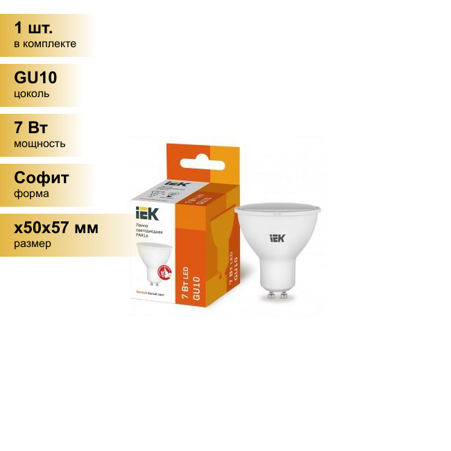 Купить Лампа светодиодная LED IEK Софит, GU10, PAR16, 7 Вт, 3000 K, теплый свет