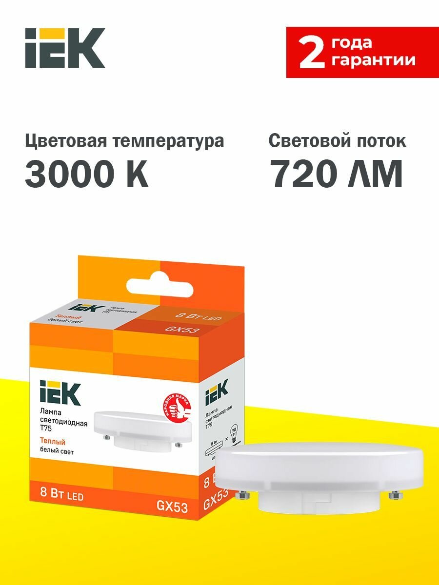 Купить Лампа светодиодная LED IEK Таблетка, GX53, T75, 8 Вт, 3000 K, теплый свет