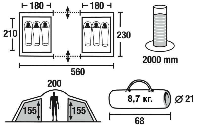 | Габариты внутренней палатки(ДxШxВ) | 180x210x155 cм |