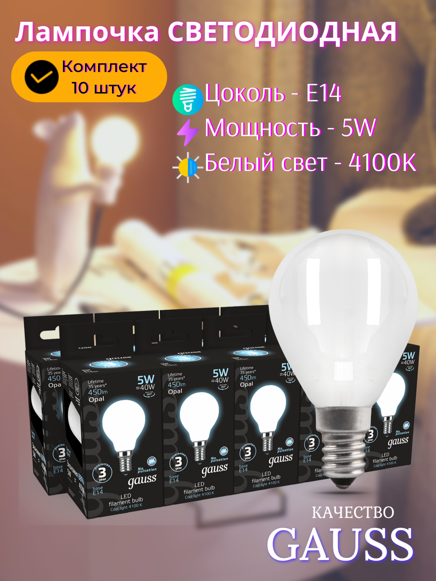 Лампочка светодиодная E14 Шар 5W нейтр белый свет 4100K упаковка 10 шт. Gauss Filament