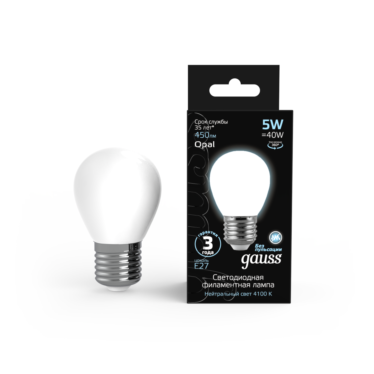 (10 шт.) Светодиодная лампочка Gauss Filament Шар G45 E27 5W(450lm) 4100K 4K матов. 80x45 филамент (нитевидная), 105202205
