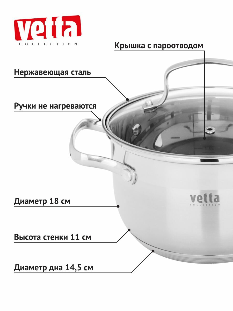 Кастрюля 1,9 л со стеклянной крышкой, нержавейка, индукция VETTA "Берн"