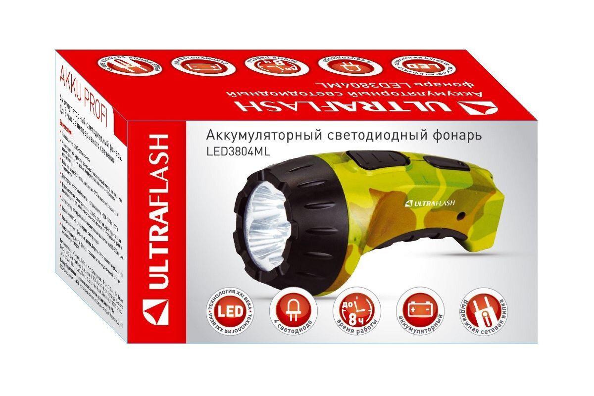 Ultraflash фонарь ручной LED3804ML (акк. 4V 0.5Ah) 4светодиодн. (15lm),камуфляж/пласт,индик.зар,вилка 220V (арт. 287180)