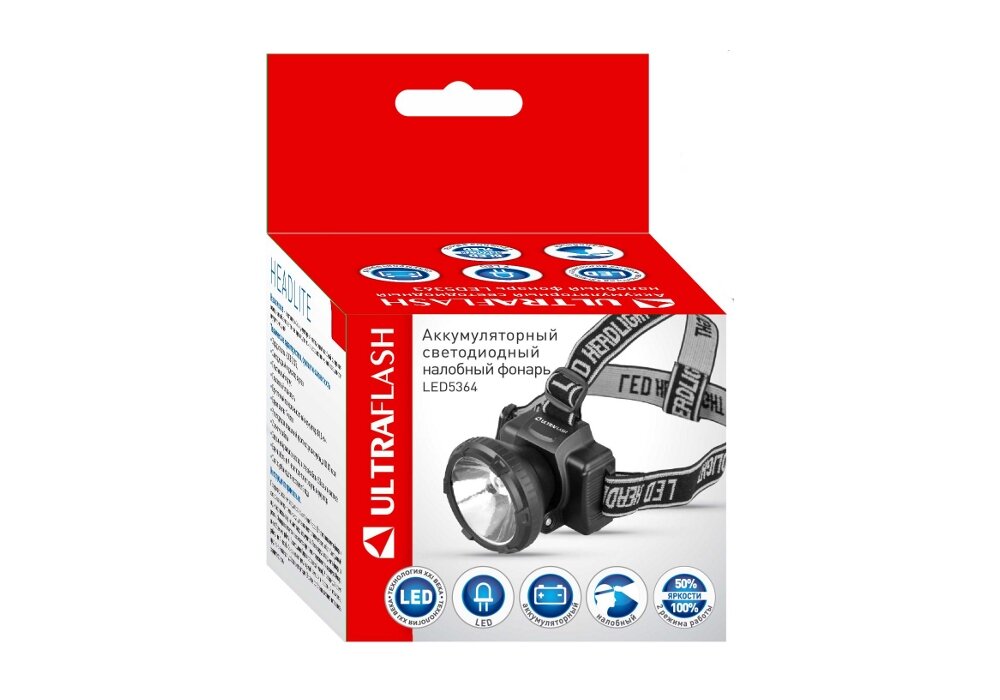 Фонарь налобный Ultraflash LED5364 аккумуляторный 220В, 0,5 Вт LED, 2 режима, пластиковый бокс, черный