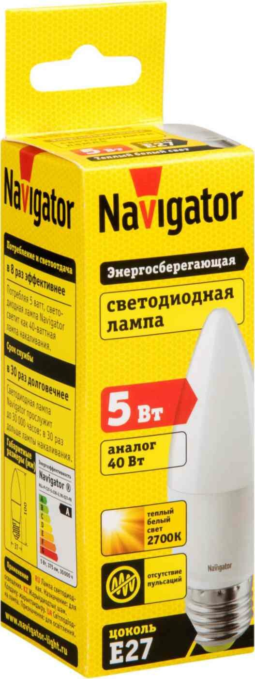 (5 шт.) Светодиодная лампочка Navigator C37 свеча, мощность 5Вт, напряжение питания 230В, цветовая температура 2700K, теплый белый свет, цоколь E27, размер 37х100 мм, NLL-P-C37-5-230-2.7K-E27-FR