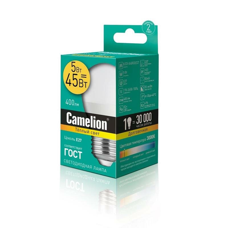 Лампа светодиодная E27, 5 Вт, 45 Вт, шар, 3000 К, свет теплый белый, Camelion