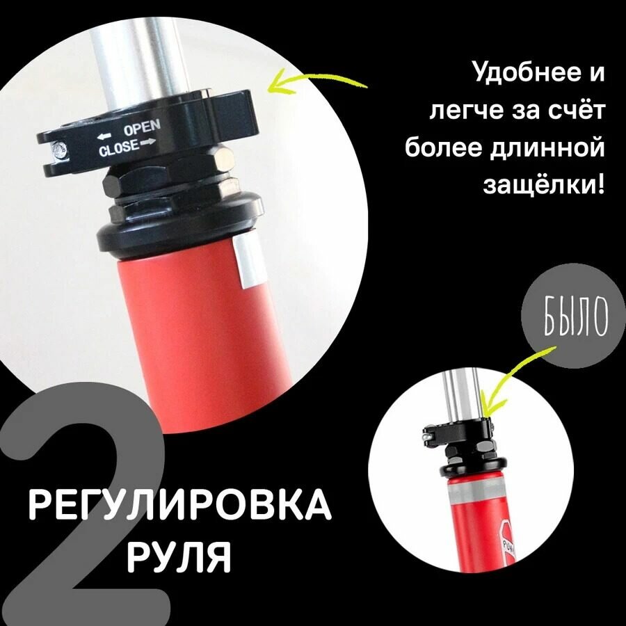 Приятно удивило, что ничего не люфтит Надежный механизм фиксации складывания. Не может разложиться на ходу. Адекватный дорожный просвет. Почти ничего не цепляет Высокий руль - удобно ездить взрослому. При этом семилетний ребенок говорит, что ему тоже удобно. |