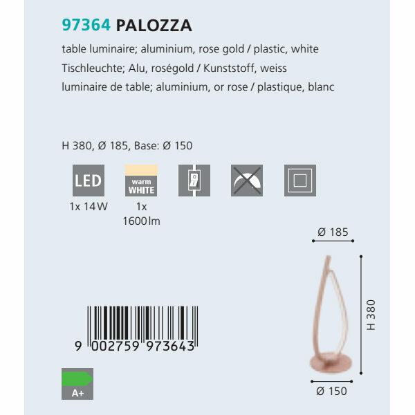 Светодиод. настольная лампа PALOZZA 97364, 1х14W(LED), Ø185, H380, основа Ø150, 1х1600lm, алюминий,