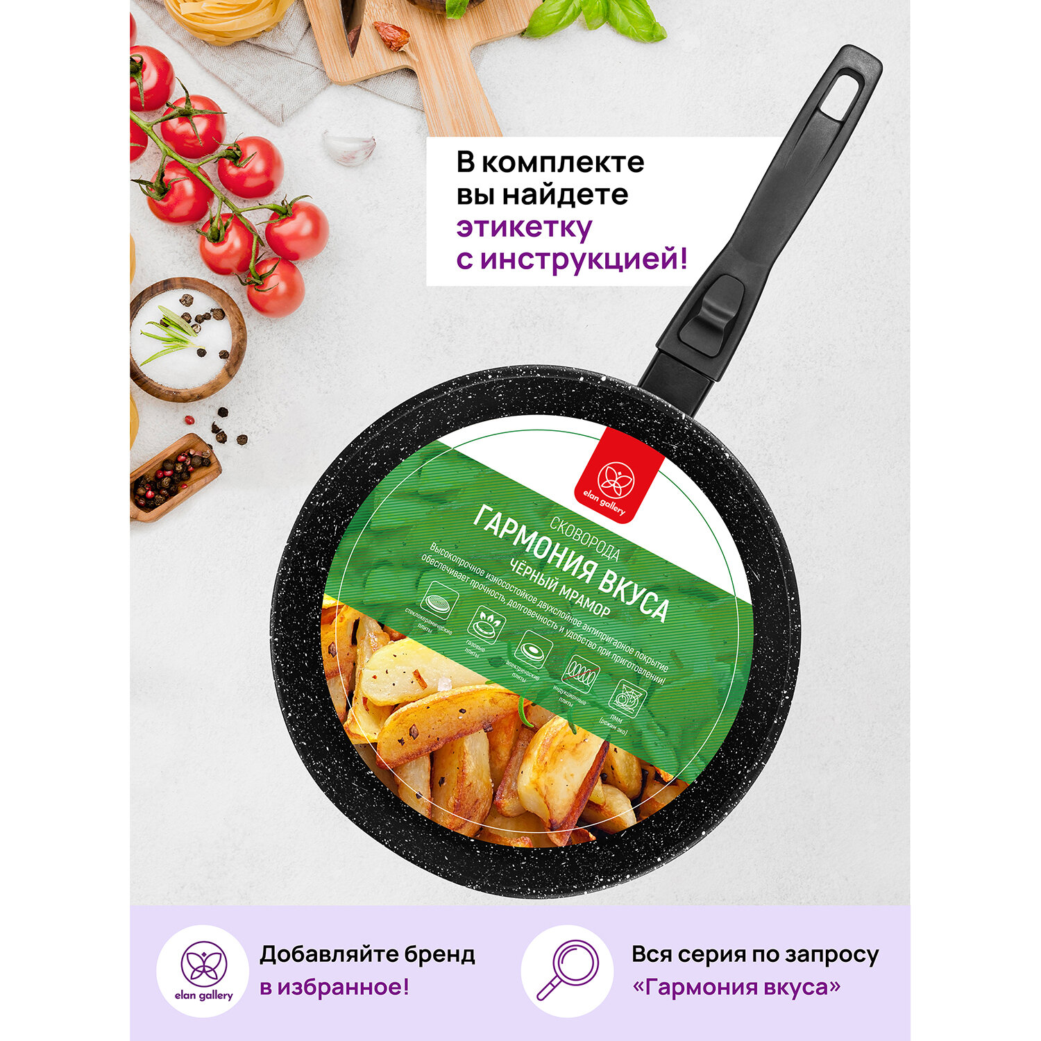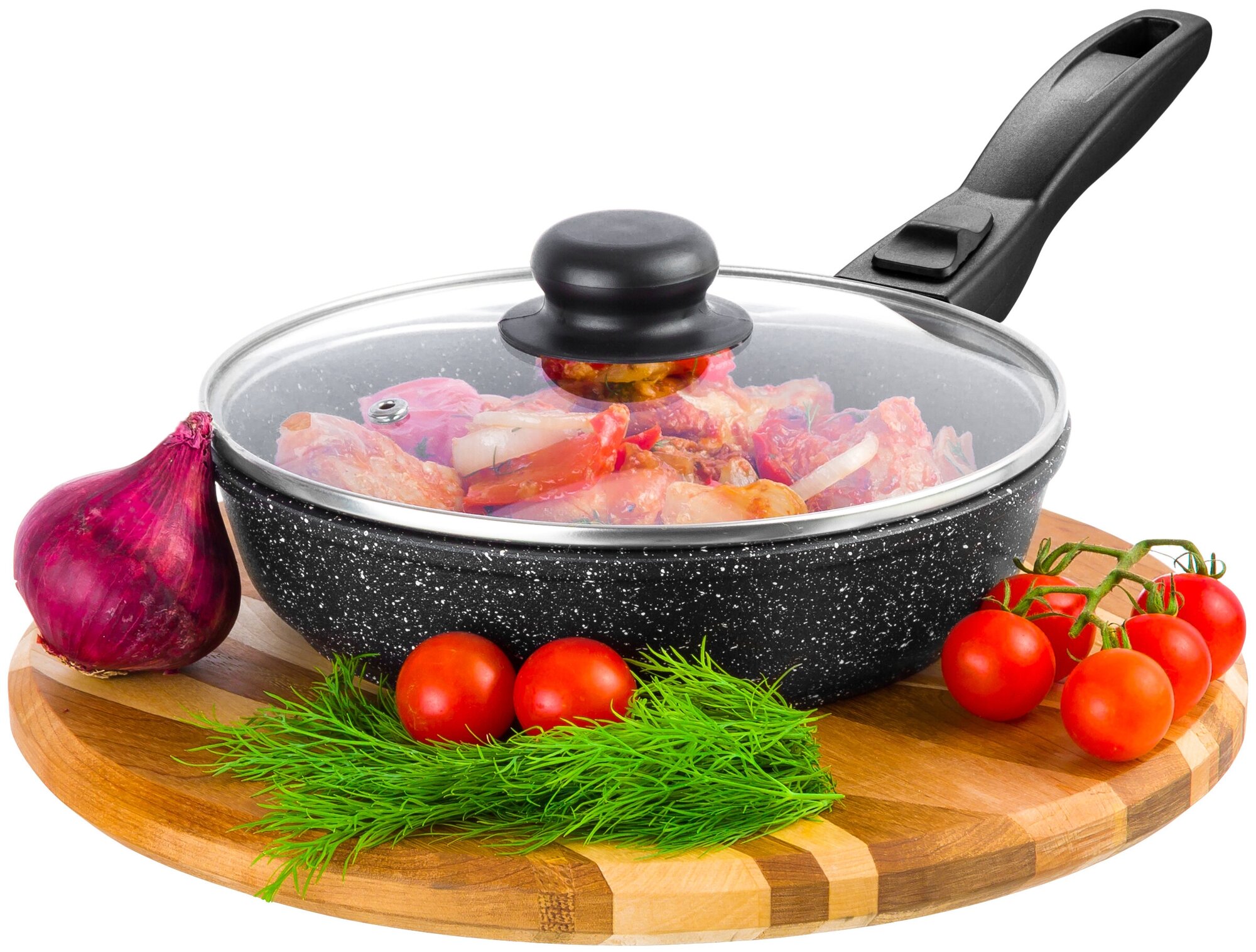 Сковорода глубокая с крышкой ELAN GALLERY гамония вкуса "Черный мрамор", 20см, съемная ручка