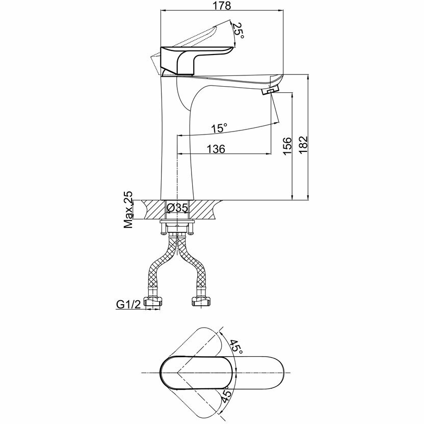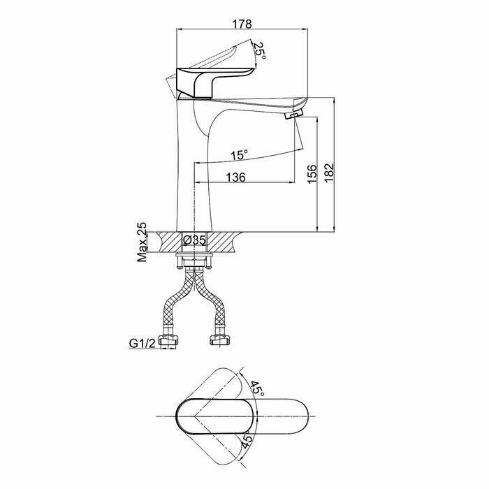 Шланги подключения на 1/2”, что позволяет обойтись без переходников, которые часто приходится ставить для евросмесителей с выходом на 3/8”. Шланги в комплекте отсоединены от смесителя, что позволяет при необходимости заменить их, подобрав нужную длину. |