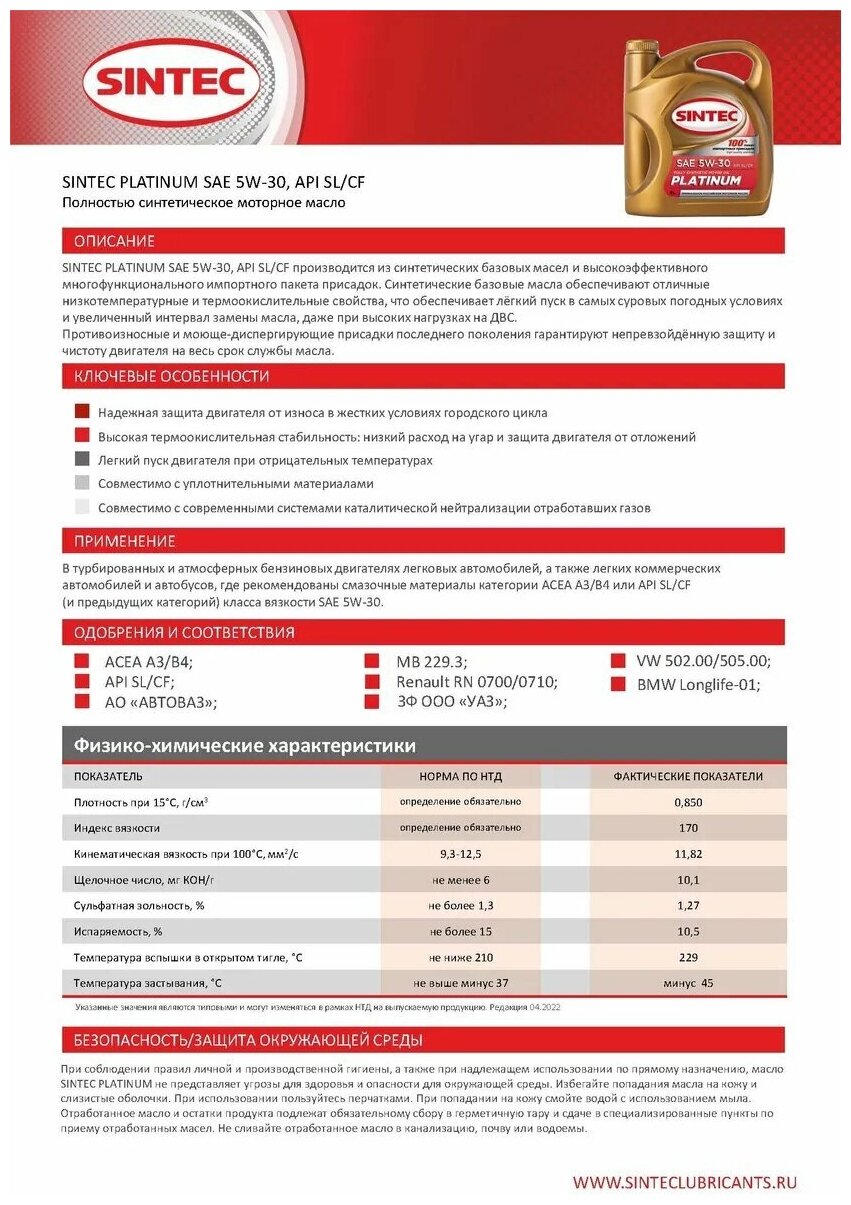СохранитьСинтетическое моторное масло SINTEC PLATINUM 5W-30 Sn/Cf, 1 л интересное: