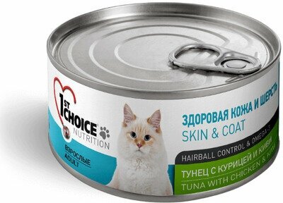 Влажный корм для кошек 1st Choice для здоровья кожи и блеска шерсти, с тунцом, с курицей, с киви 85 г