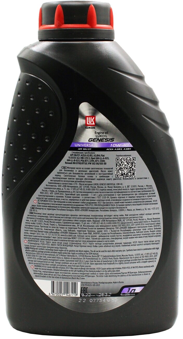 LUKOIL 3148644 Лукойл GENESIS Universal 10W-40 п/с (1л) API SN ACEA A3/B3, A3/B4 API CF MB 229.3 PSA B71 2300/2294 VW 502 00/505 00 Renault RN 0700/0710