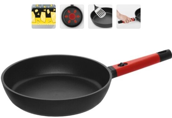 Выбор остановился на этой сковороде в первую очередь из за съемной ручки . Удобно хранить и удобно готовить в духовке. Так же нравится внешне, красная ручка и черное покрытие- это классика Пользуюсь сковородой несколько месяцев, купили до нового года. Покрытие стойкое , антипригарное. Мою в посудомойке. К сковороде докупила крышку . Рекомендую к покупке |
